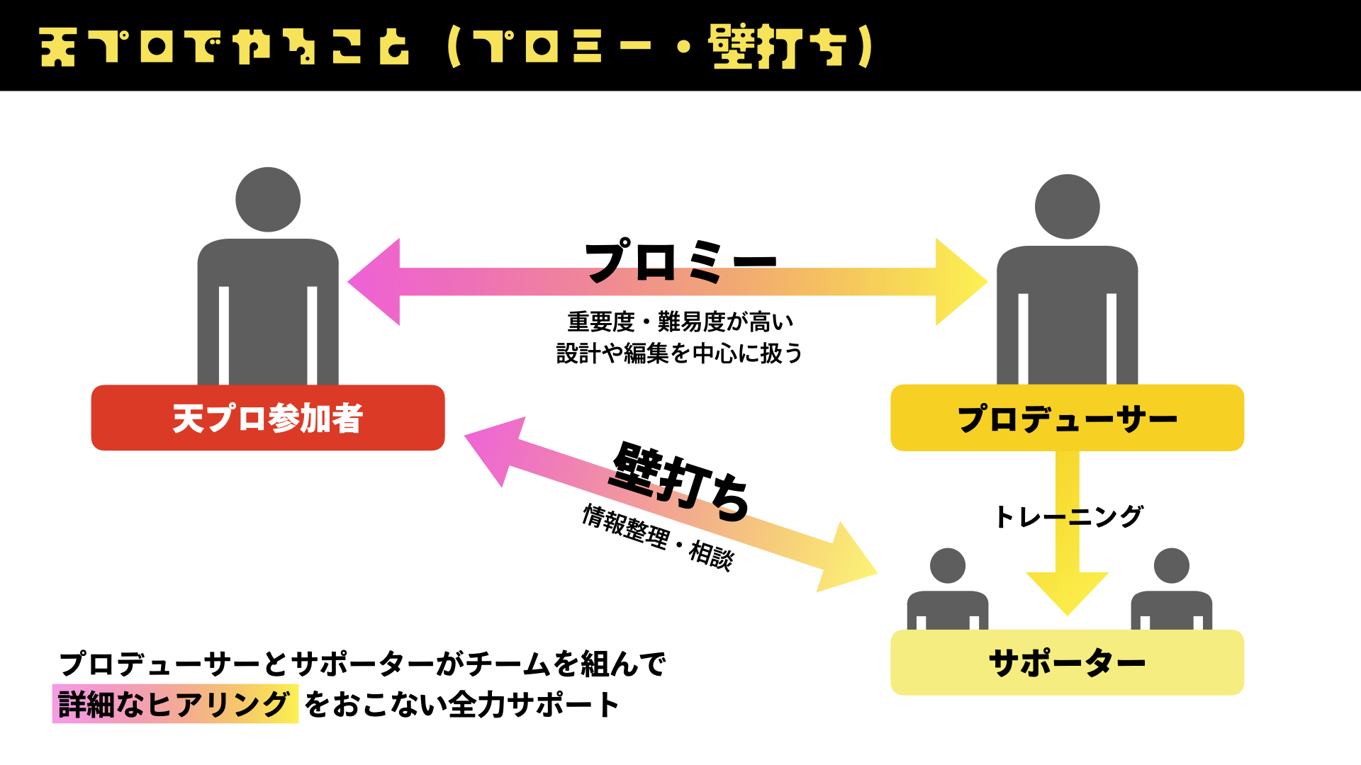 プロデューサーは、やまけんから直接プロデューサーになるためのトレーニングを週1ペースで1年以上受けて、かつ基準を満たしてやまけんが認定をした人たちです。
