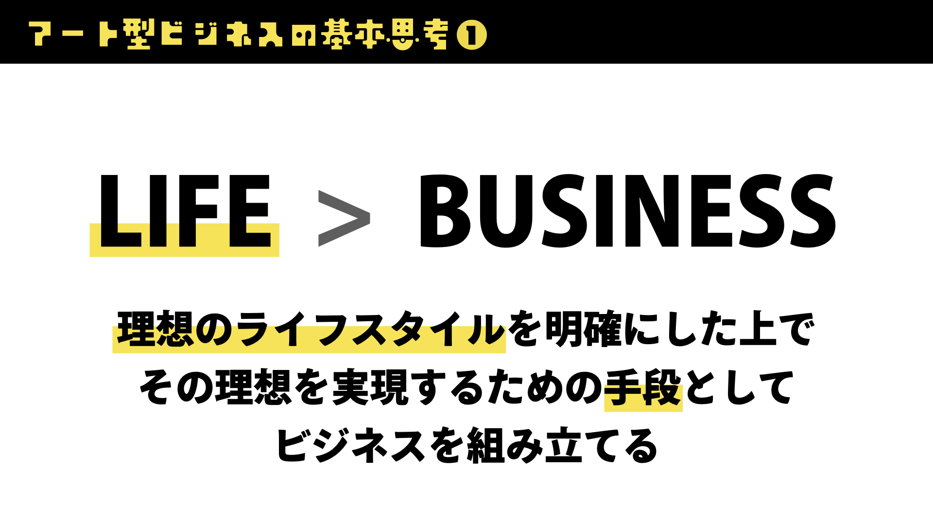一般的なビジネスの考え方は「売上を上げること」が目的になりがちです。でも、アート型ビジネスではビジネスはあくまで手段であり、目的は「幸せな人生を送ること」だと考えます。