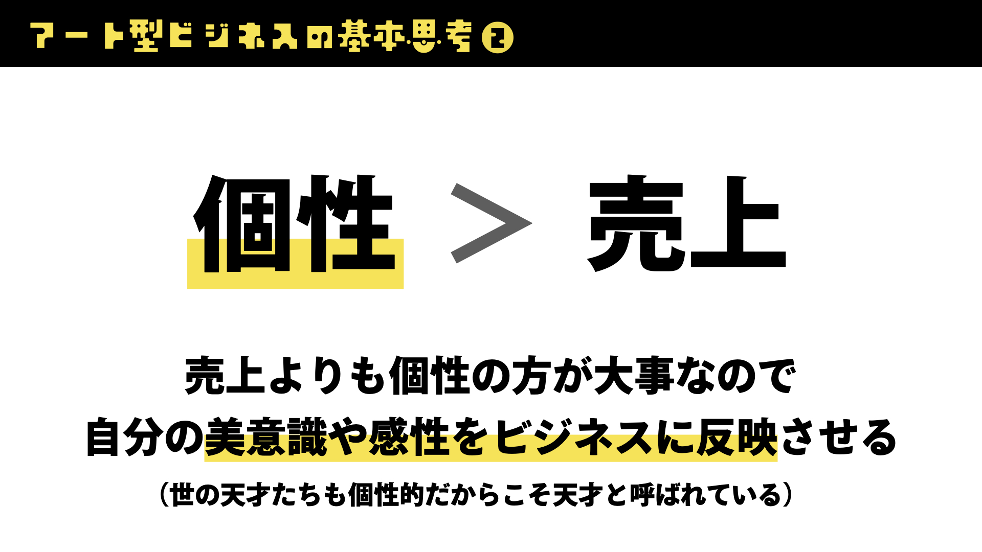 多くのビジネス書は「効率よく稼ぐこと」を重視しますが、アート型ビジネスではビジネスを自己表現の手段と捉え、自分の個性や美意識を反映させることを大切にします。