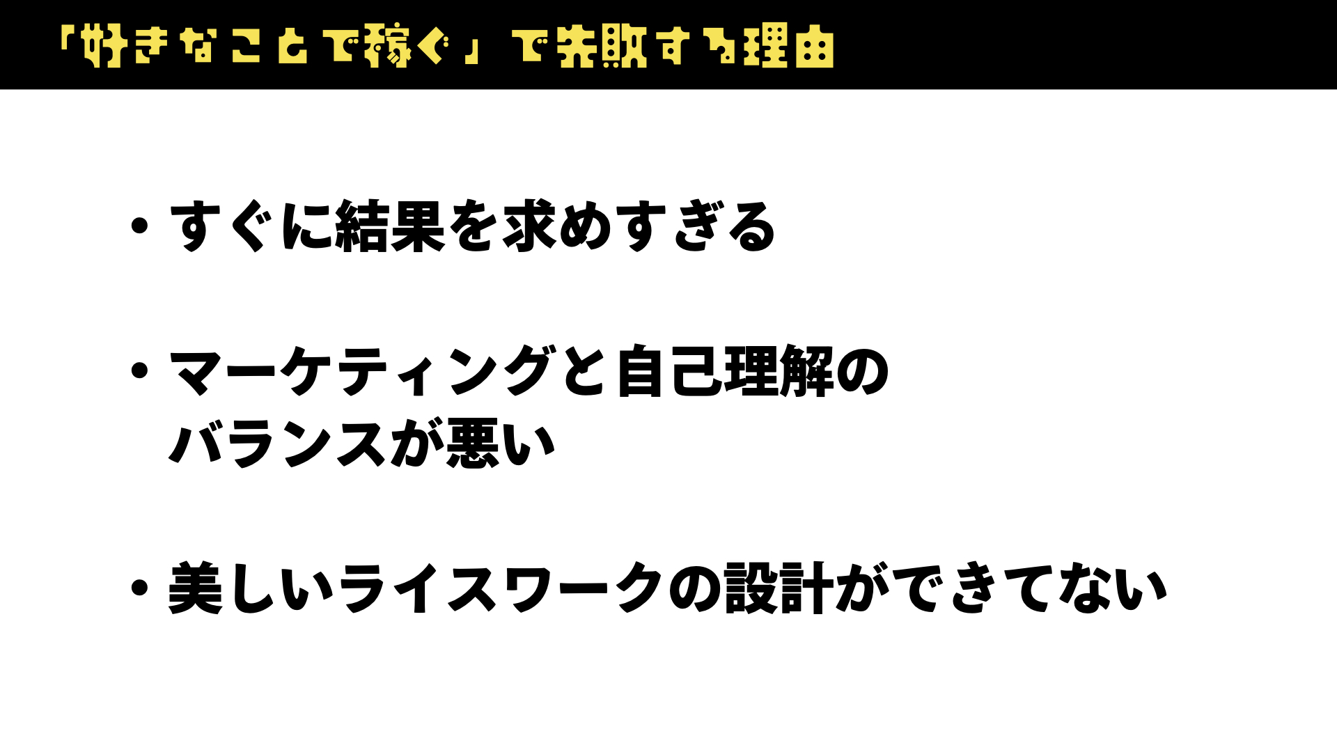 多くの人が「好きなことで稼ぐ」に失敗する理由は、次の3つです。