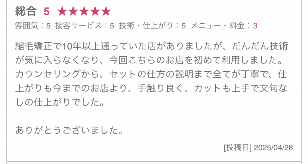 「私、美容室どこにしていいかわかってなくて。毎回変えて今まで100件くらい回ってるかもしれないんですけど。だからわかるんですけど今までで1番うまいです」