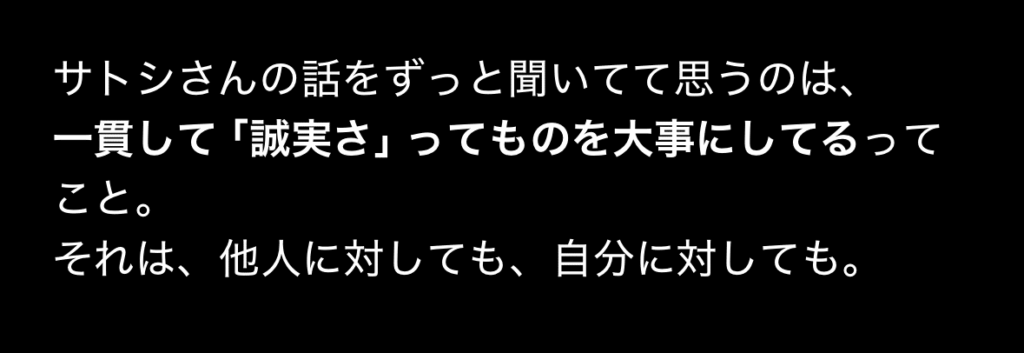 言い換えれば自分にウソがなく誠実である。を体現しているからこそカッケーなーと思うし、自分の力で道を切り開いてきたのもカッケーなーと思う部分だった。